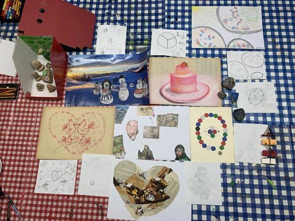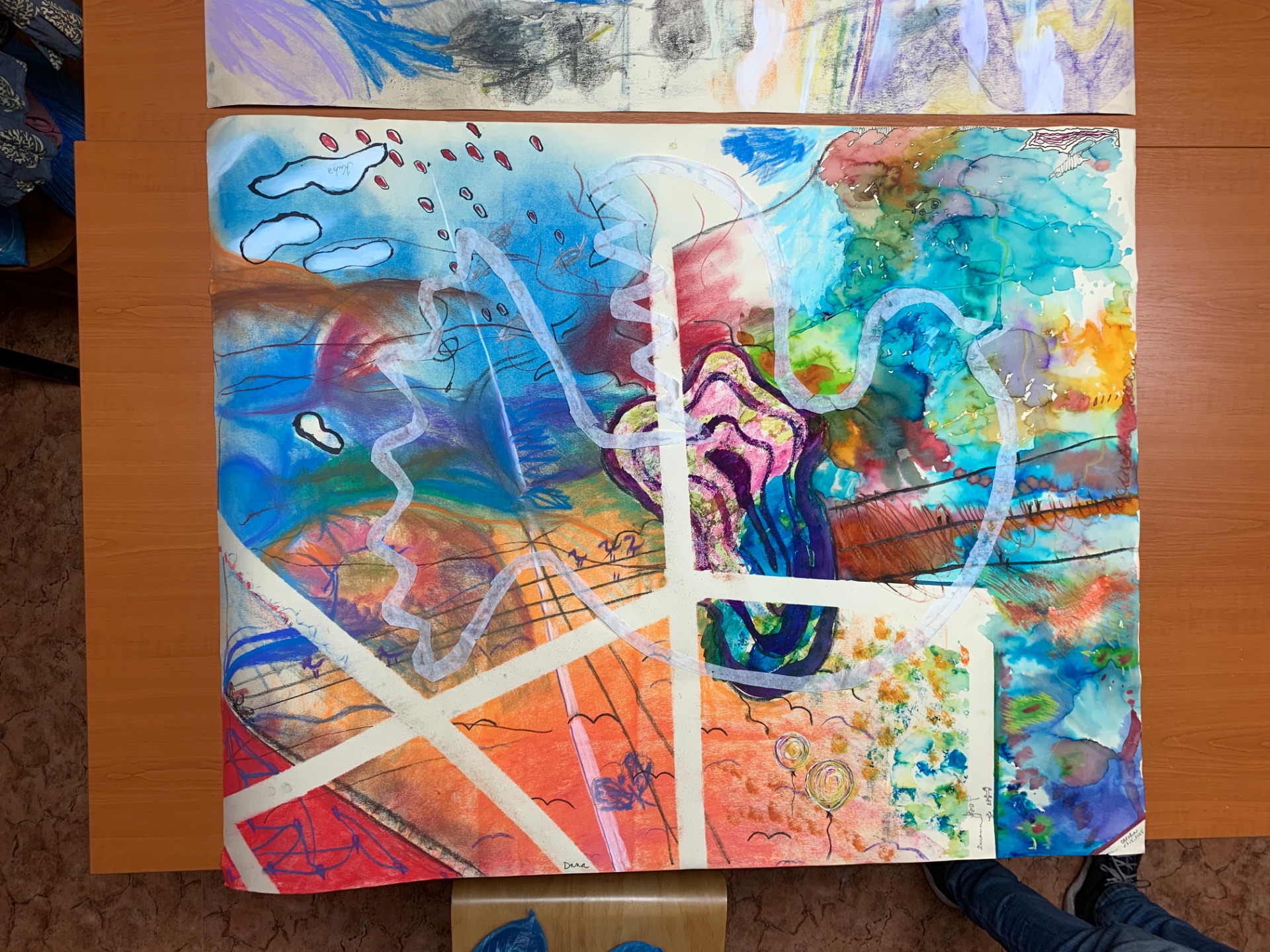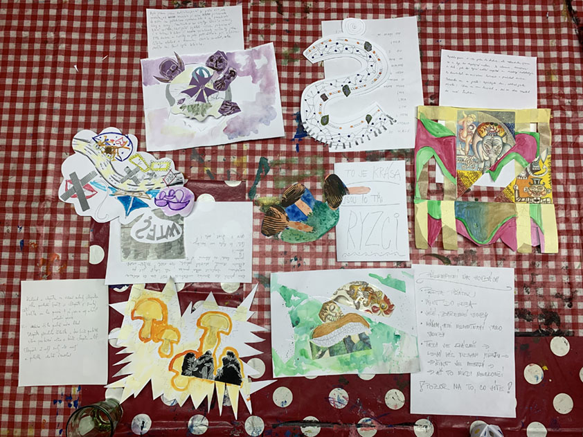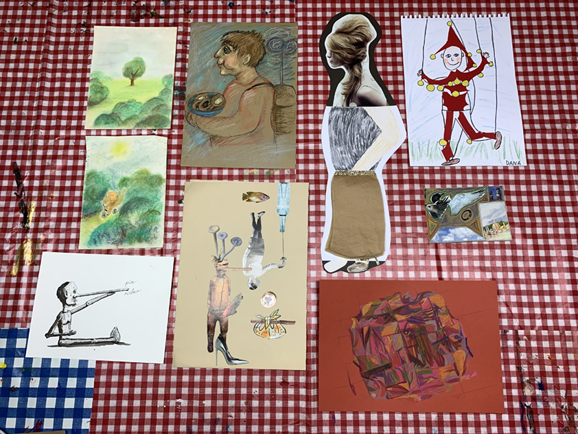 Zadání: Ztvárnit svojí rodinu vybranou formou (zvířata, flora, nábytek, hudební nástroje, atp…) na jeden obraz a zaměřit se na vztahy a konstelace...